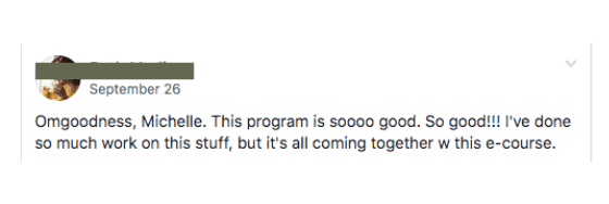 "Michelle's approach is so refreshing. She really gets you to dig deep and asks thought-provoking questions that I had never explored before. Many courses I had taken always talked about finding your passion, but never delved into the power of emotional branding like Michelle did. Her hands-on approach and transparency was refreshing. I appreciate her approach to building a strong foundation from the start." - Lora D.