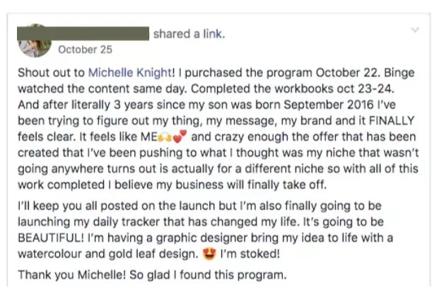 “My business made 3 times as much money in 6 months than what I did in the previous year TOTAL. And I 100% credit that TO MY BRAND that Michelle helped me find."