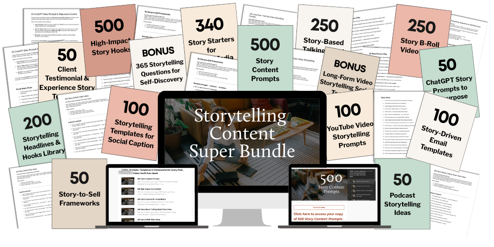 I understand the power of storytelling for brands, and I've created this bundle to make your life easier. The Storytelling Content Super Bundle is your shortcut to thousands of done-for-you prompts, hooks, and templates to keep your content flowing with ease.